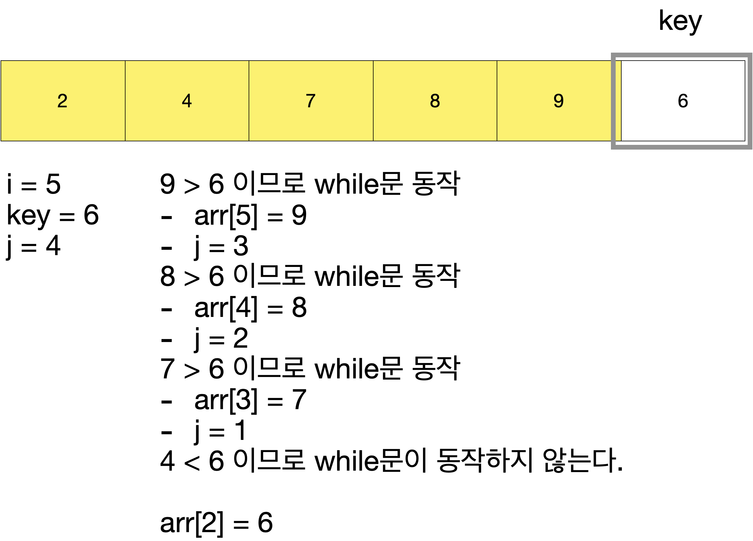while (j >= 0 && arr[j] > key) { // 정렬된 배열에서 제일 큰 숫자의 인덱스부터 0번 인덱스까지 비교하면서 현재 값이 key보다 크면,